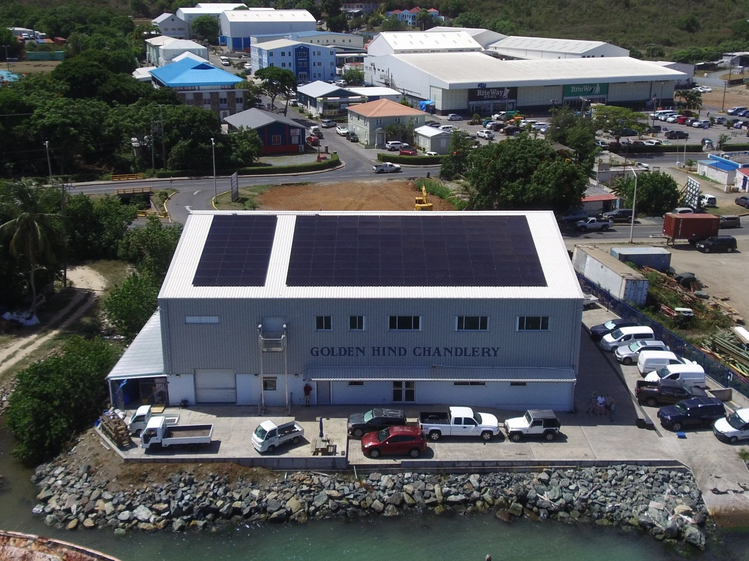 Initially installed before hurricane Irma struck the BVI, the roof array was destroyed by an airborne shipping container and required a rebuild following Irma. The system had already turned a profit in year four, after being rebuilt 20% larger than the original DC array using updated modules. This installation is the largest solar array in the BVI.